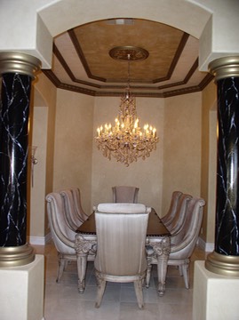 Evan installed the the crown molding and finished it in a decorative antique bronze, applied a thirteen layer Bellissimo Plaster on the perimeter ceiling and Lusterstone Plaster on the center ceiling, painted the light medallion and column caps aged bronze, transformed the white columns into a Faux Black Marble and finished off the walls in a decorative faux finish